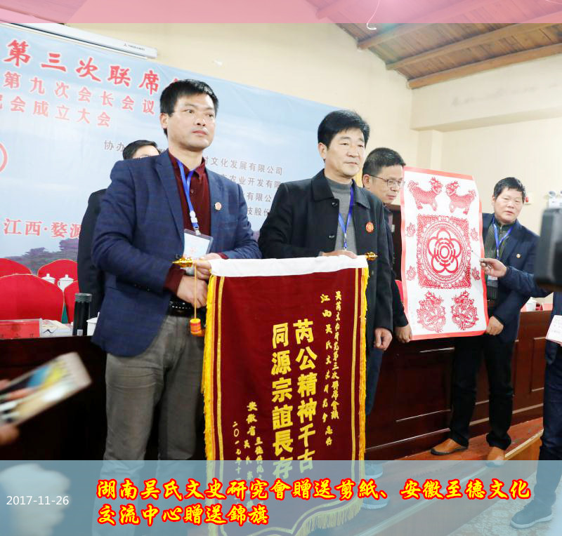 會(huì)議期間,大會(huì)向參會(huì)人員贈(zèng)送了《吳芮文化文集》一書。部分吳文化研究團(tuán)體和個(gè)人向大會(huì)贈(zèng)送了錦旗、書法作品,譜牒,書籍、剪紙等禮品。大家紛紛起立,熱烈鼓掌,攝像師留下了這令人難忘的一刻。