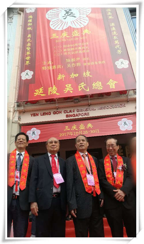 2017年10月29日,新加坡延陵吳氏總會(huì)“三慶盛典”在總會(huì)會(huì)址駐地門前廣場隆重舉行。吳立興會(huì)長率領(lǐng)泰伯吳氏祖地宗親聯(lián)誼總會(huì)代表團(tuán)參加活動(dòng),受到特別隆重相待,吳立興會(huì)長第一個(gè)致詞,活動(dòng)安排放在首席位置。