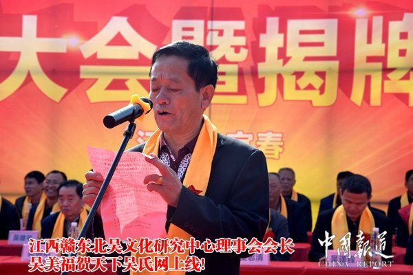 中國(guó)報(bào)道訊 吳美福,男,1956年10月生,福籍贛邑萬年縣,現(xiàn)定居縣城。函授政治學(xué)本科學(xué)歷,1997年任萬年縣吳姓文化研究協(xié)會(huì)會(huì)長(zhǎng)于今年已十一年,2013年任江西贛東北吳文化研究中心理事會(huì)會(huì)長(zhǎng)至今五年,2017年發(fā)起閩浙贛吳文化經(jīng)濟(jì)促進(jìn)會(huì)。2013年參加發(fā)起“泰伯論壇”,多年來,致力于吳氏聯(lián)誼懇親,聯(lián)系、聯(lián)絡(luò)各地吳家,走訪了絕大多數(shù)國(guó)內(nèi)各地宗親和一部分海外宗親。
