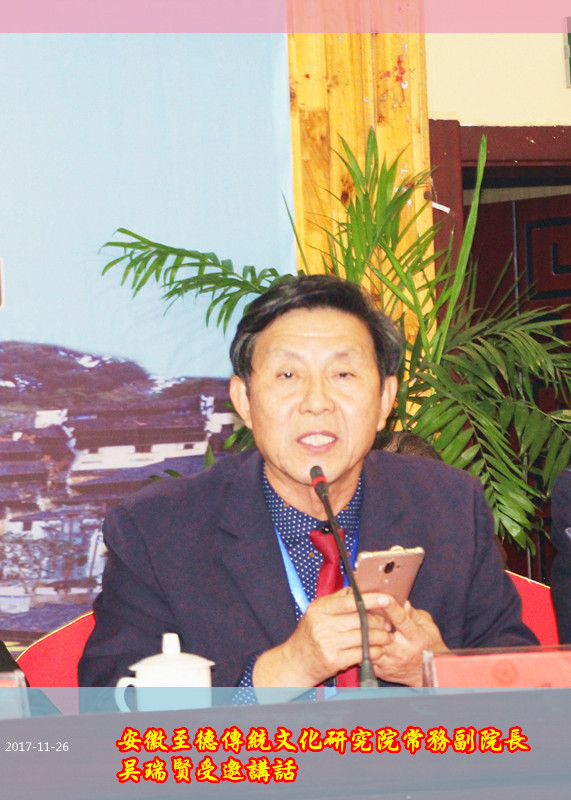 安徽至德傳統(tǒng)文化研究院、安徽至德傳統(tǒng)文化交流中心代表團(tuán)成員吳義敏、吳朗、吳曙光、吳志堂、吳海祥、吳問(wèn)孝、吳艮節(jié)等一行在常務(wù)副院長(zhǎng)兼秘書(shū)長(zhǎng)吳瑞賢率領(lǐng)下應(yīng)邀出席會(huì)議。