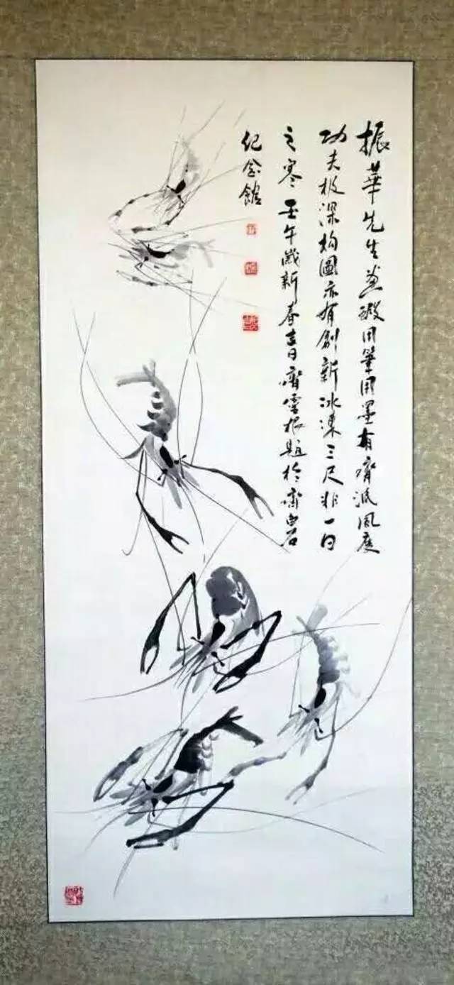 功底雄厚地振華先生秉承白石畫蝦之風(fēng)骨,潛心探索。如今,已臻于爐火純青的境界,將繪畫墨分五色運用到筆墨以外的意境中,把白石畫蝦“一筆三色””的筆法表現(xiàn)得淋漓盡致,一筆下來,他畫的蝦給人一種通體透明、晶瑩逼真之感,使畫面產(chǎn)生色彩的變化,完美地表現(xiàn)物象,令人稱道。整個作品聚散有法,布局講究,雖然簡單的筆墨線條,卻表現(xiàn)出了蝦的韻律感,體現(xiàn)出蛟龍的氣勢。