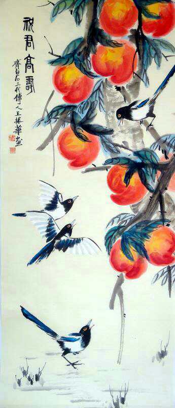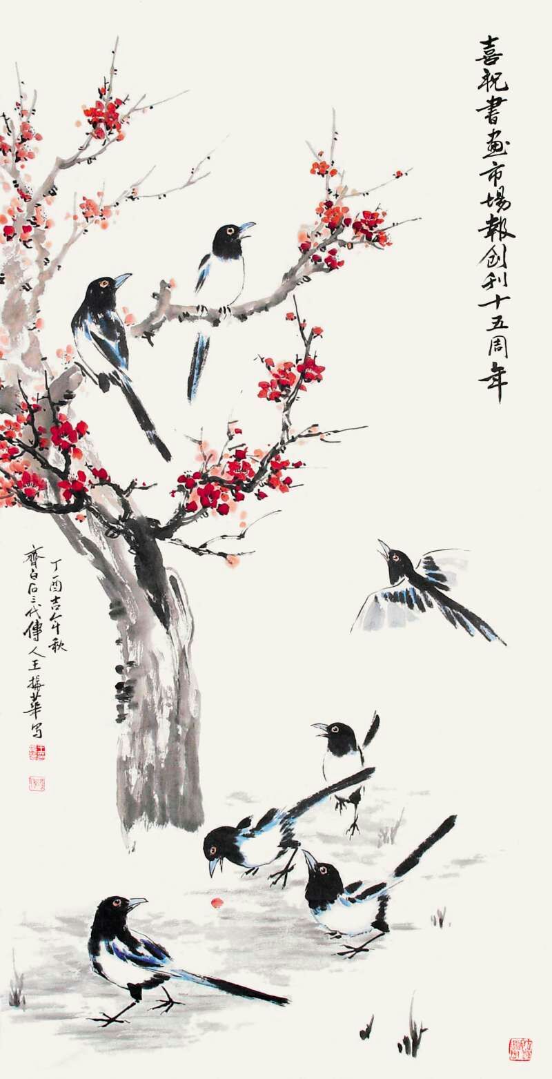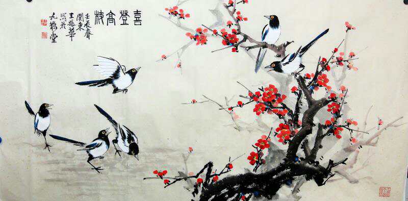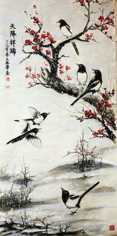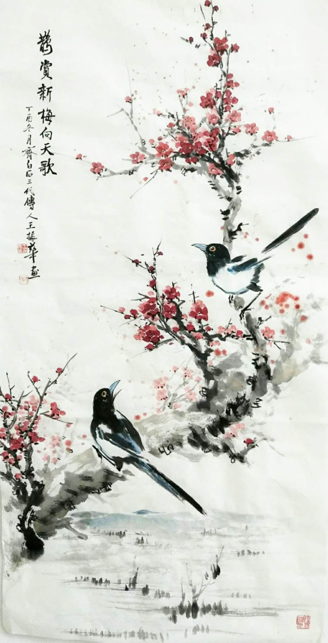 1993年的一天,也是振華先生藝術(shù)提升的機緣轉(zhuǎn)折點,偶遇在學(xué)校當老師的我國著名繪畫大師齊白石的第二代傳人王長久先生,王振華感到機不可失,便挑選了十幾副畫作找到王老師請教拜師,王老師看完振華先生的作品后,贊不絕口,欣然將其納為入室弟子。他在研習(xí)藝術(shù)的道路上,得王長久先生口傳心授,精心點撥,使悟性極高的振華先生對齊白石大師的藝術(shù)真諦有了深刻領(lǐng)悟。為豐富藝術(shù)的多元化,又在王老師的建議下,振華先生又開始涉獵畫喜鵲等題材。齊白石的:“學(xué)我者生,似我者死”名言。讓振華先生有了新的思考,雖然成了齊白石第三代傳人,更不想就此炫耀自己,他決心探索一條適合自己的藝術(shù)之路。記得,宋代大文豪歐陽修曾寫過贊美喜鵲的詩句:“鮮鮮毛羽耀明輝,紅粉墻頭綠樹林;日暖風(fēng)輕言語軟,應(yīng)將喜報主人知。”喜鵲作為吉祥的象征,歷來被人們所喜愛。振華先生以前也畫過喜鵲,但在王老師的指點下,有了飛躍的進步,不過每次拜訪老師都是不厭其煩的給他講解讓之感動!他認真學(xué)習(xí)細心揣摩,他憑借童年的印跡提筆表意,畫作如同進入了蘇軾的詩句那樣:“牧童弄笛炊煙起,采女謠歌喜鵲鳴”的佳境。振華先生為了實現(xiàn)藝術(shù)家的抱負,將自己的畫室改成“九鵲堂”。他意味深長地告訴王老師:“北京有榮寶齋,關(guān)東有九鵲堂。希望將來從九鵲堂中飛出的喜鵲為天下的人們報平安。”通過振華先生的不懈努力,“關(guān)東喜鵲王”的雅號早已在我國藝壇、藏界流傳。從此,振華先生工作之余經(jīng)常到郊外去觀察喜鵲,可謂“爬冰臥雪”、“廢寢忘食”,幾個小時下來腰酸背麻,眼睛酸疼,但他不在乎這些,他注意觀察喜鵲的千姿百態(tài),用速寫方式將其記錄下來。由于細心觀察和反復(fù)琢磨,所以日后他筆下的喜鵲總以粗筆濕墨,獨具神色。清晨遙望碧藍天空,當人們聽到喜鵲清脆的叫聲,更是喜上眉梢。喜鵲在民間就有被稱之“喜鵲神”、“鵲橋”之美譽。