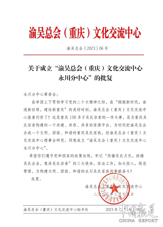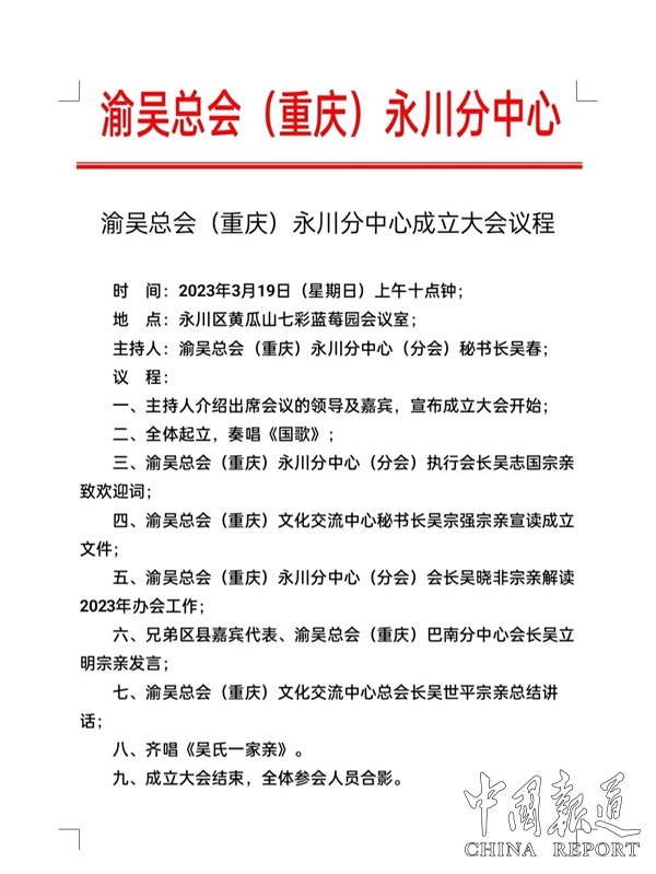 我們深切而誠摯地期待:渝吳總會(重慶)文化交流中心永川分中心成立大會必將——又是一年芳草綠,依然十里杏花紅!再為渝吳總會遞交一份滿意的答卷,創(chuàng)就渝吳總會優(yōu)秀區(qū)縣分中心的壯麗篇章。