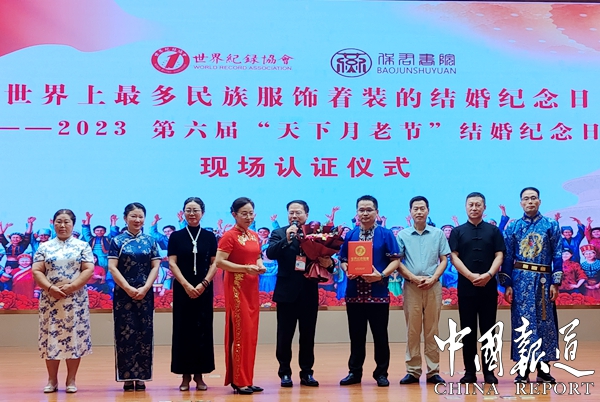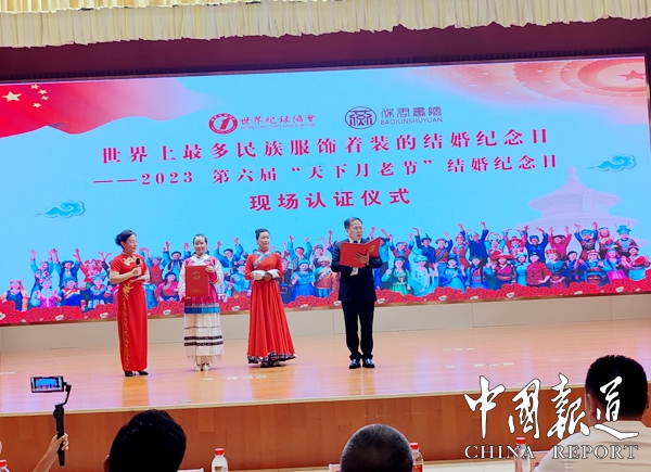 在活動現(xiàn)場,世界至徳總會副主席、保君書院創(chuàng)始人燕保君教授以視頻方式發(fā)表熱情洋溢地開幕詞,燕保君介紹,從2018年到2022年,保君書院舉辦了五屆天下月老節(jié)相親活動,有好多家庭都嘗到了這個文化給帶來的成果,原來不愿意正式結(jié)婚的,不愿意生育的,通過參加月老節(jié)活動,以及參加活動中開展的婚前指導(dǎo)和婚后疏導(dǎo)課程,都愿意舉辦一次正式的婚禮,也愿意生兒育女,實現(xiàn)血脈傳承,帶來更多的新生力量!100對著少數(shù)民族服裝夫妻結(jié)伴上臺領(lǐng)證,世界紀(jì)錄成功認(rèn)證官張健公布認(rèn)證結(jié)果及豐富多彩的文藝節(jié)目演出為第六屆“天下月老節(jié)”劃上完美句號。