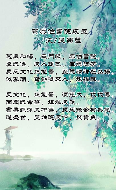 惠風(fēng)和暢,三門(mén)峽,泰伯書(shū)院。喜訊傳,成人達(dá)己,至德流芳。吳氏文化正能量,至德精神在弘揚(yáng)。似春潮,驚動(dòng)后來(lái)人,旗艦飄。吳文化,正能量,須光大,代代傳。因聞?dòng)嵜P,坦然成賦。書(shū)香飄滿大中華,吳氏后裔樹(shù)典范。逢盛世,吳姓遍天下,聚賢良。