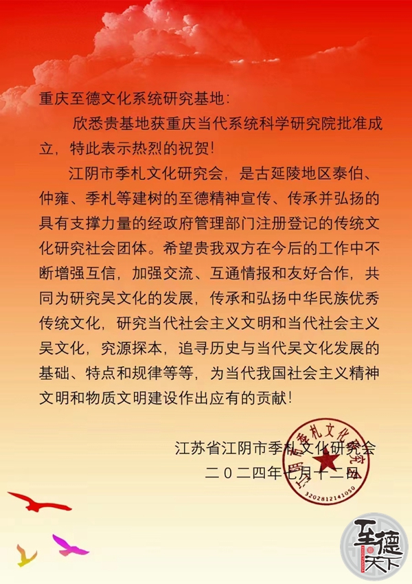 江蘇省江陰市季札文化研究會致重慶至德文化系統(tǒng)研究基地賀信