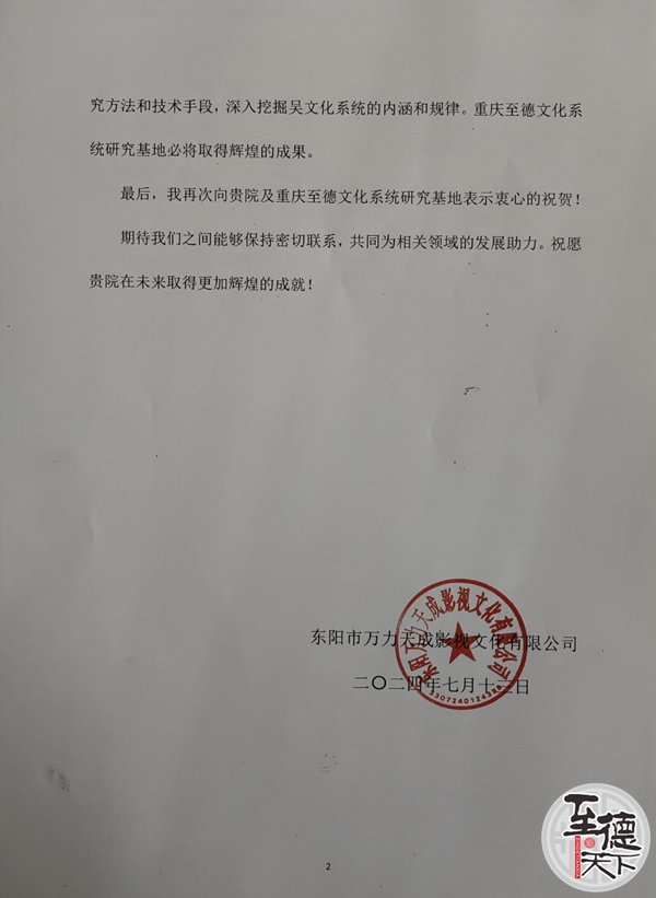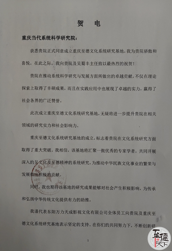 東陽(yáng)市萬(wàn)力天成影視文化致重慶至德文化系統(tǒng)研究基地賀電