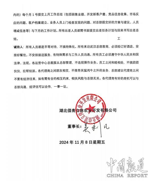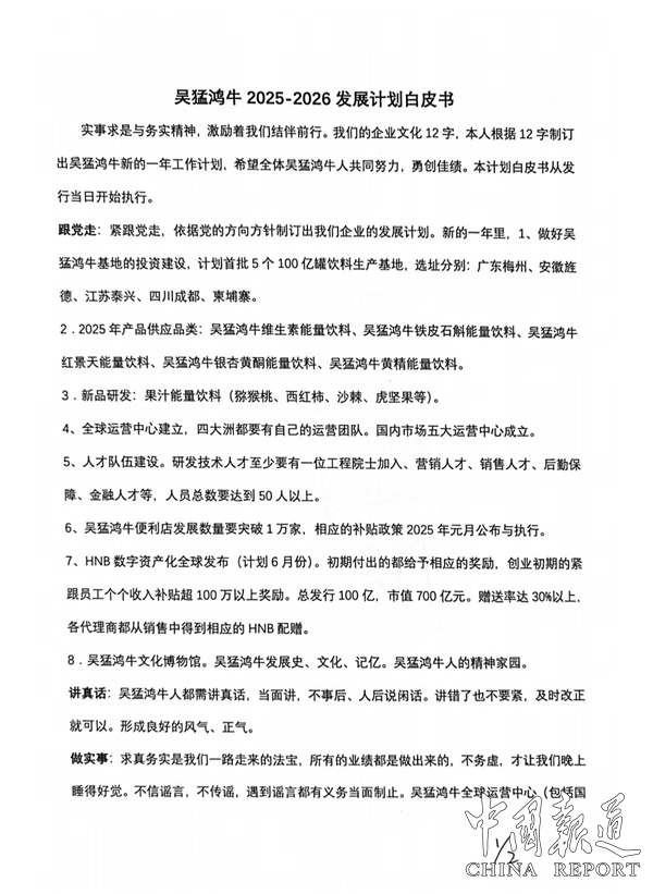 中國報道訊(吳蜀豐報道)11月8日,湖北倡青立體農(nóng)業(yè)開發(fā)有限公司董事長吳利凡擬定的《吳猛鴻牛2025--2026發(fā)展計劃白皮書》介紹,實事求是與務(wù)實精神,激勵著我們結(jié)伴前行。我們的企業(yè)文化12字,根據(jù)12字制訂出吳猛鴻牛新的一年工作計劃,希望全體吳猛鴻牛人共同努力,勇創(chuàng)佳績。本計劃白皮書從發(fā)行當(dāng)日開始執(zhí)行。