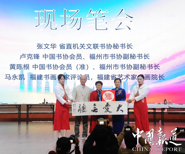 [全國(guó)中老年網(wǎng)專家委員會(huì)特聘專家、今日中國(guó)論壇福建省辦事處高級(jí)顧問、閩中紅色文化促進(jìn)會(huì)創(chuàng)會(huì)會(huì)長(zhǎng)、瑞金市紅色文化傳承協(xié)會(huì)榮譽(yù)會(huì)長(zhǎng)吳燕秋女士(中)應(yīng)邀到大會(huì)現(xiàn)場(chǎng),省直機(jī)關(guān)書協(xié)秘書長(zhǎng)張文華(左1)代表大會(huì)主辦方將《大愛無(wú)疆》墨寶贈(zèng)與吳燕秋會(huì)長(zhǎng),剪紙非遺傳承人董雅萍同時(shí)將剪紙作品贈(zèng)與吳燕秋會(huì)長(zhǎng),梁躍毅攝]