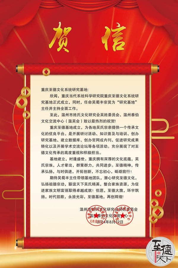 溫州市姓氏農(nóng)化研究會吳姓委員會致重慶至德文化系統(tǒng)研究基地賀信