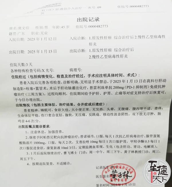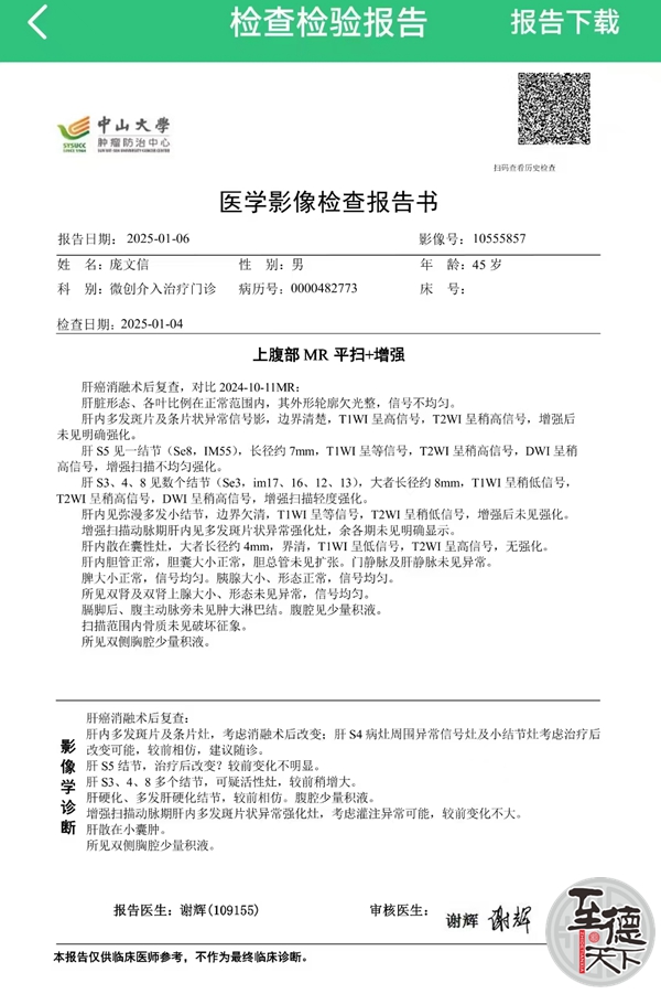 一位肝癌患者,服用吳家育醫(yī)師開(kāi)的中藥半個(gè)月后,去醫(yī)院做檢查的結(jié)果,與前次的檢查報(bào)告單對(duì)比,效果明顯。這是醫(yī)院檢查的報(bào)告單內(nèi)容:中山大學(xué) STSUCC 腫瘤防治中心  ,醫(yī)學(xué)影像檢查報(bào)告書 ,報(bào)告日期:2025-01-06 ,影像號(hào):10555857,姓 名:龐文信 ,性 別:男 ,年齡:45歲 科 別:微創(chuàng)介入治療,門診 病歷號(hào):0000482773 。