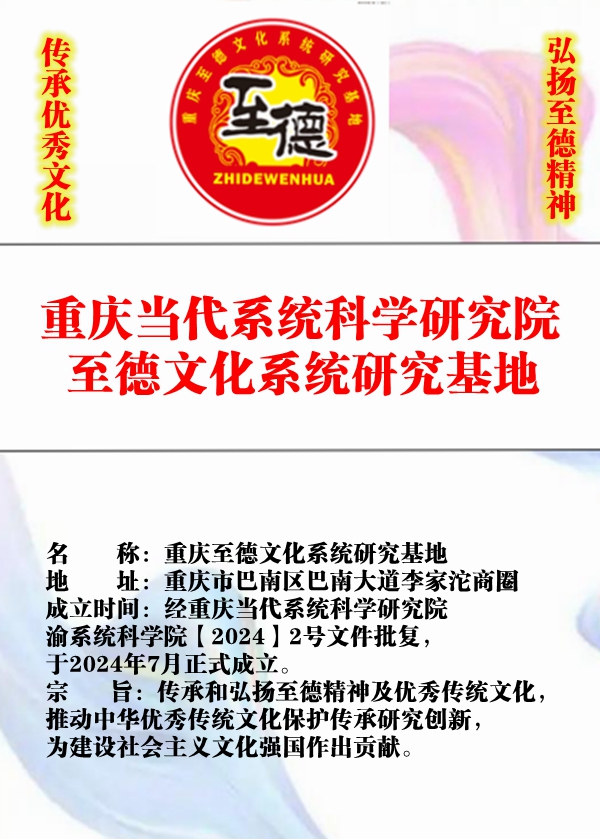 重慶至德文化系統(tǒng)研究基地是一個專注于至德文化系統(tǒng)研究的重要機構(gòu)。重慶至德文化系統(tǒng)研究基地是重慶當代系統(tǒng)科學研究院的直屬機構(gòu),經(jīng)渝系統(tǒng)科學院【2024】2號文件批復正式成立。其宗旨在于認真貫徹習近平文化思想,堅持用習近平新時代中國特色社會主義思想凝心鑄魂,推動中華優(yōu)秀傳統(tǒng)文化保護傳承研究創(chuàng)新,為建設社會主義文化強國作出貢獻。