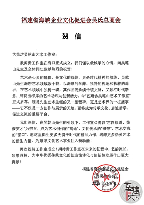 福建海吳總商會(huì)致藝苑坊吳乾山藝術(shù)工作室賀信