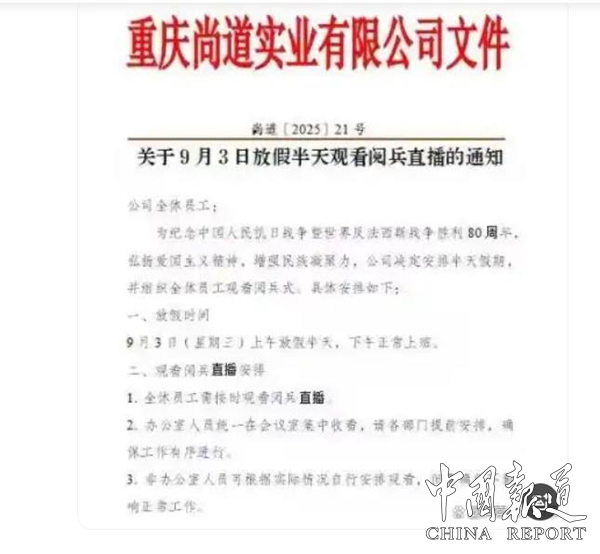 另悉,9月3日,重慶尚道實(shí)業(yè)有限公司直接甩出王炸通知——“放假半天看九三閱兵,看《731》還能報(bào)銷電影票!” 網(wǎng)友銳評:“別人家的公司,連愛國都這么卷!