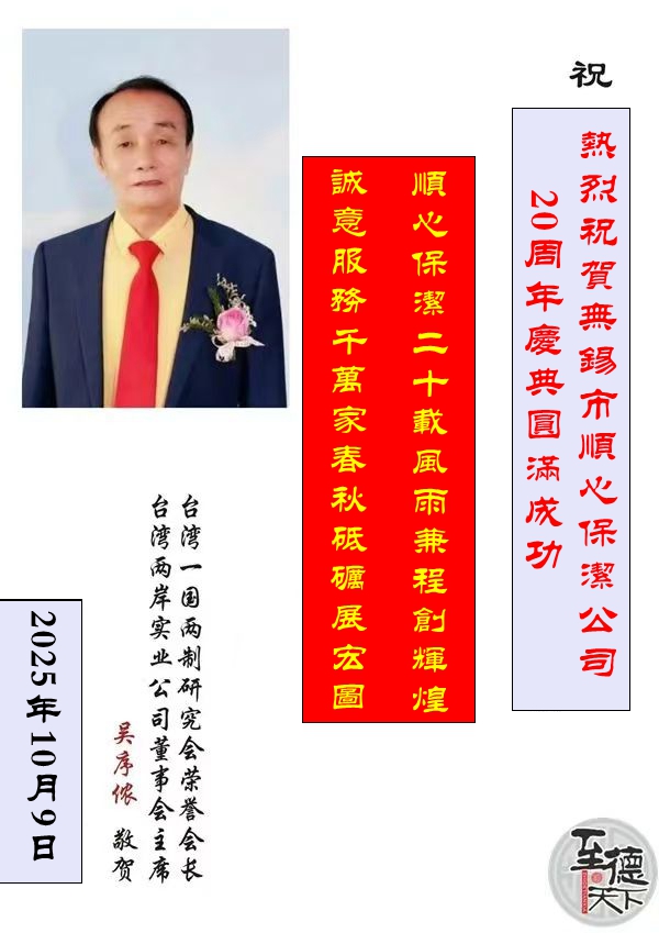 臺(tái)灣兩岸實(shí)業(yè)公司致無錫市順心保潔賀信