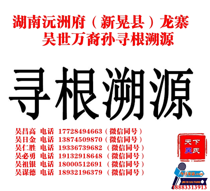 今日采訪網訊 吾開基祖公吳世萬生于南宋紹定2年己丑(1229年),先封百戶,后追封千戶侯。先祖自宋朝年間從原“江西南昌府豊城縣落暮鄉(xiāng)(落市鎮(zhèn))十字街豬城巷寅山申向坐東朝西”遷湖南沅洲府(新晃縣)龍寨,生一子(品象)、十二孫(12房族),目前后裔孫蕃衍達40余萬人。因譜牒失傳,世萬公后裔孫幾百年來始終在苦尋根源而未能認祖歸宗,急盼雄公、洪公,宗公三支同胞后人或知情宗親與尋宗人聯(lián)系為盼!