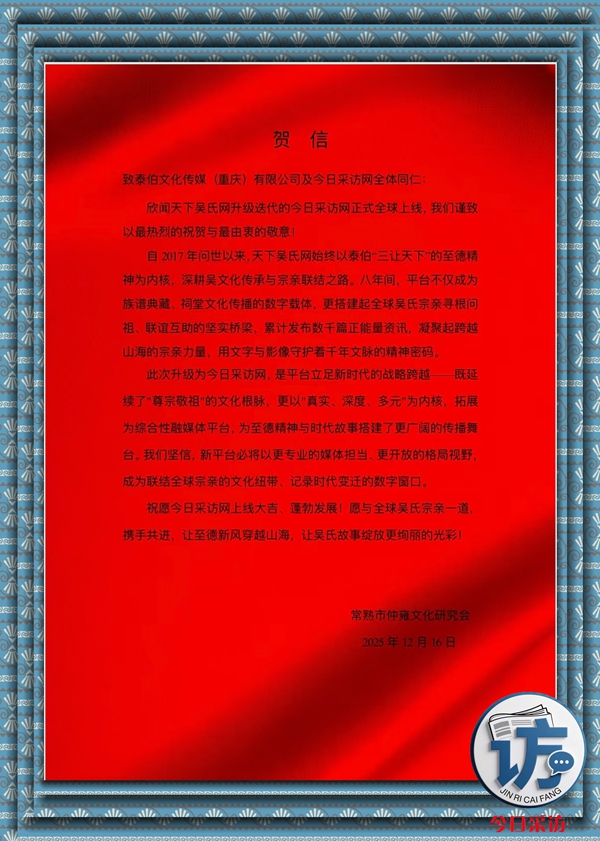 【關(guān)于我們】今日采訪.com?天下吳氏網(wǎng)?至德傳媒網(wǎng)隸屬于泰伯文化傳媒(重慶)有限公司獨家運營的三網(wǎng)合一公益性網(wǎng)站,集官網(wǎng)?APP?自媒體?抖音?視頻號?公眾號同步傳播的綜合性融媒體平臺。