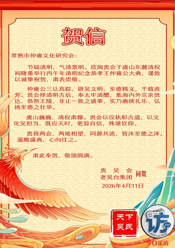 節(jié)屆清明,氣清景明。欣聞貴會于虞山東麓清權(quán)祠隆重舉行丙午年清明紀(jì)念恭孝王仲雍公大典,謹(jǐn)致以誠摯祝賀,肅表崇敬。