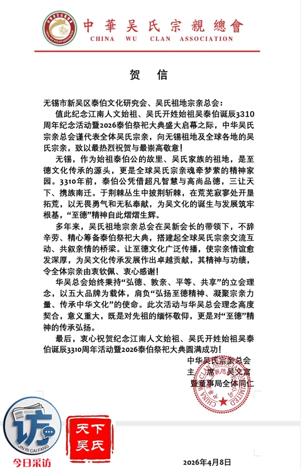 中華吳氏宗親總會(huì)致無錫市新吳區(qū)泰伯文化研究會(huì)