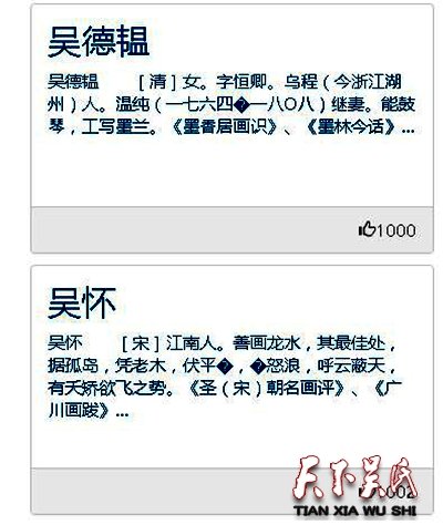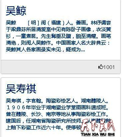 吳道子,唐代著名畫家。被后人奉為"畫圣"。其畫線條遒勁雄放,變化豐富,一變古來沿襲的高古游絲描的細筆,發(fā)展了線描的藝術(shù)方法,故表現(xiàn)出來的物象富有運動感、節(jié)奏感,被人們稱為"吳帶當風"。吳承恩,明朝小說家。著有《西游記》傳世。吳勉,貴州黎平侗族英雄。吳起,戰(zhàn)國時著名軍事家。衛(wèi)國人。初為魯將,繼為魏將,后奔楚國,任令尹,主持變法,后被殺。吳廣,秦末農(nóng)民起義領(lǐng)袖。公元前209年與陳勝發(fā)動戍卒九百人起義,建立張楚政權(quán)。后為部將田臧假借陳勝命令殺害。吳敬梓,清代人,以小說《儒林外史》而著稱的杰出諷刺作家。吳沃堯,清代著名小說家。著有《二十年目睹之怪現(xiàn)狀》。吳昌碩,清代著名的篆刻家、書畫家。工詩,善書法,尤精篆刻。吳其濬,清代著名政治家、科學家。著有被譽為19世紀中國重要的植物學著作《植物名實圖考長編》22卷和《植物名實圖考》38卷。