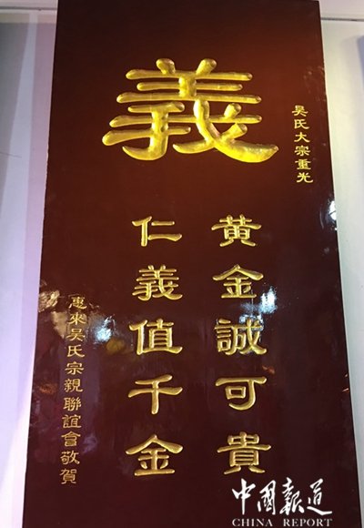 同年西吳 翻修家廟 宗賢松泉 捐資贊助 於斯同時 海岱族親 建愛敬堂 流慶綏遠