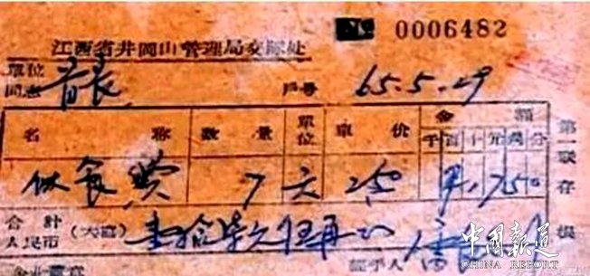 1965年5月22日,離開35年的毛澤東重返井岡山,毛主席是1965年5月22日下午5點左右到的,28日上午9點多離開。前后7天。這位連喝茶都要交錢的領(lǐng)袖,再這短短7天內(nèi),一樣的公私分明。收藏在韶山紀念館的這兩張發(fā)票,足以證明毛澤東那幾近嚴苛的公私分明,這是1965年他重游井岡山后,由井岡山交際處開具的發(fā)票。上面的是首長伙食費7天,每天2.5元,合計17.50元。另一張是首長交糧票23斤。