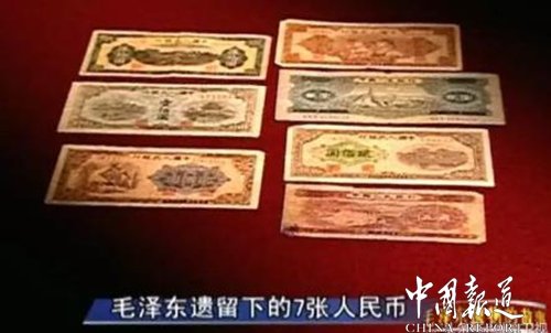 毛新宇說:“從爺爺去世以后,他老人家的全部遺產(chǎn),包括生前用過的遺物,一律都由中央辦公廳保管,不僅我的父母,李敏、李訥姑姑都沒從爺爺那兒分到遺產(chǎn),但是我們永遠繼承爺爺?shù)倪@種偉大的精神遺產(chǎn)。”被傳說得沸沸揚揚的毛澤東巨額稿費之謎,至此應(yīng)該劃上句號了,而毛澤東這個本可擁有巨額財富的人,在他去世后,所遺留的全部現(xiàn)金財產(chǎn),只有工作人員找到的這7張建國初期發(fā)行的人民幣,五張舊版,兩張新版,合計不到今天的十塊錢。