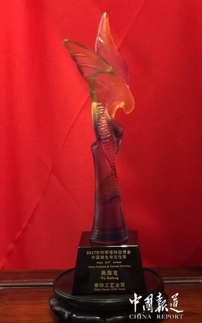 中國報道訊(記者吳蜀豐)最近幾天連日來,各大網(wǎng)相繼報道第五代紫砂壺傳承人吳海龍大師在上海世博中心領取了“2017年阿斯塔納世博會中國美食與文化館紫砂工藝金獎”。雖不懂紫砂文化,但能夠把紫砂工藝帶出國門走向世界,這是件了不起的事情。懷著一顆敬仰之心,我走進了吳海龍大師去了解他,了解紫砂文化。