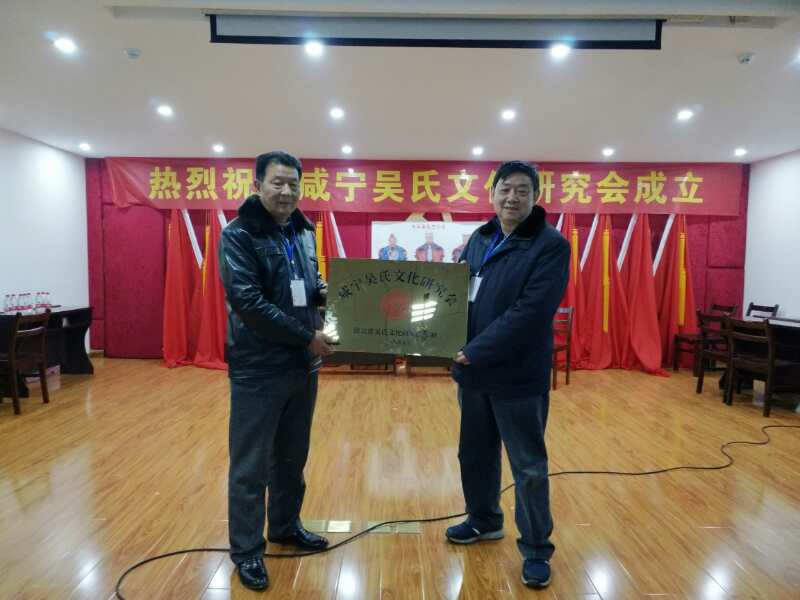 湖北吳氏文化研究會(huì)執(zhí)行會(huì)長(zhǎng)吳合林向咸寧吳氏文化研究會(huì)吳棠斌會(huì)長(zhǎng)頒發(fā)會(huì)牌