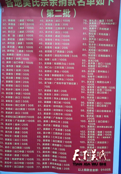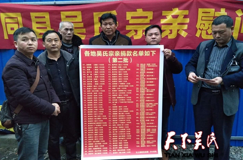 火災(zāi)無情,人間有愛!在受災(zāi)宗親最需要幫助的關(guān)鍵時刻,會同縣吳氏宗親經(jīng)濟(jì)文化發(fā)展聯(lián)誼會聞風(fēng)而動,及時核實災(zāi)情,發(fā)出募捐倡議,并利用微信,QQ等先進(jìn)的現(xiàn)代傳媒手段,把募捐信息迅速傳遍全國二十多個省市區(qū)。會同縣本地及周邊兄弟省區(qū)縣的吳氏宗親以及社會各界愛心人士弘揚(yáng)“一方有難、八方支援”的傳統(tǒng)美德,大家不因距離的遙遠(yuǎn)而冷漠,不因身份的不同而無情,個個慷慨解囊、捐款捐物對受災(zāi)者予以無私援助,以不同方式傳遞著人間真情,譜寫了一曲患難與共、感人肺腑的動人樂章。