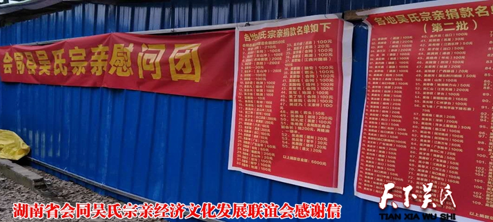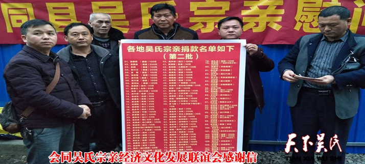 因為大家的愛心捐款,受災(zāi)宗親的情緒得到了一定的安慰; 因為大家的愛心捐款,受災(zāi)人員的吃飯穿衣住宿等基本生活問題得到了初步解決; 因為大家的愛心捐款,會同縣團(tuán)河鎮(zhèn)吳家團(tuán)蔓延著濃郁的宗親之情,同胞之愛的和諧溫馨氣息……在此,會同縣吳氏宗親經(jīng)濟(jì)文化發(fā)展聯(lián)誼會謹(jǐn)向無私奉獻(xiàn)的全國各地的吳氏宗親及社會各界愛心人士,表示衷心的感謝并致以崇高的敬意!