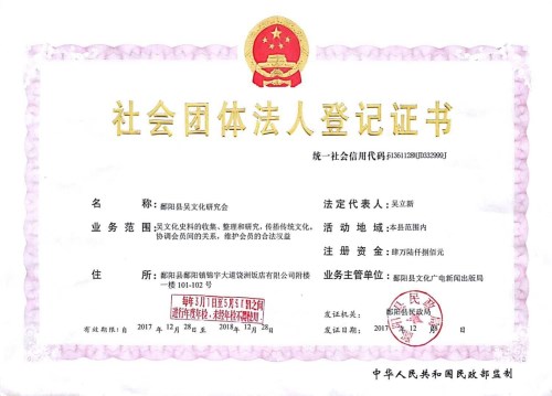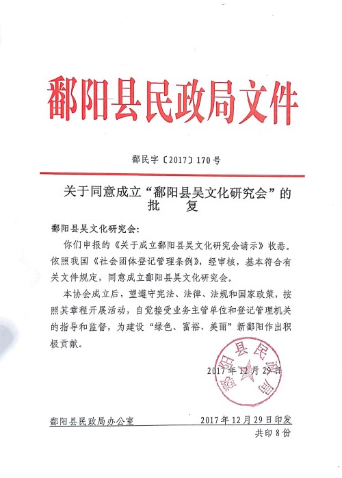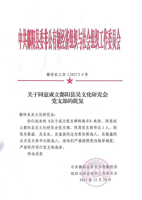 在鄱陽縣吳文化研究會會長吳立新、吳敬盛、吳東先、吳顯俊等宗親的努力下,于 2017年12月20日,中共鄱陽縣委非公有制經(jīng)濟、組織與社會組織工作委員會批復同意鄱陽縣吳文化研究會成立鄱陽縣吳文化研究會黨支部,同意設支部書記1人,同意吳敬盛、吳東先、吳顯俊同志為委員候選人,吳敬盛同志為黨支部書記候選人。