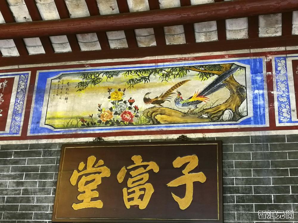 穿過檐廊就來(lái)到了宗祠的主堂,祖梁面闊3間,進(jìn)深1間,深6.1米,13架梁,正中間的墻上有一幅彩繪圖案,畫的是花鳥與青松,旁邊還配有詩(shī)句。彩繪圖案的下邊有一塊木匾,上書“子富堂”。