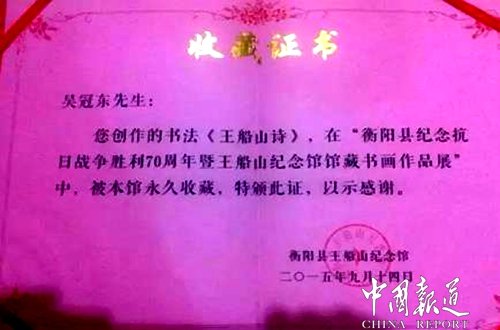 吳冠東:是的。不僅是義工協(xié)會的,只要是我知道的任何社會團(tuán)體組織的慈善拍賣,我都會毫不猶豫地送去我的精品力作。自從我進(jìn)入書畫圈以來,只要我參與的活動,基本上都獲得了一定的榮譽(yù)和獎賞。承蒙各界朋友的抬愛,目前,我已經(jīng)被聘請為“船山潤物書畫社”副社長、“大海書畫院”副院長以及“香港宅妝設(shè)計(jì)師事務(wù)所”和“素文化裝飾設(shè)計(jì)工程公司”特聘的書法顧記者,作品除被眾多藏家和愛好者收購?fù)猓€被《衡陽保衛(wèi)戰(zhàn)紀(jì)念館》《王船山紀(jì)念館》以及長沙的《黃興紀(jì)念館》等永久性收藏。