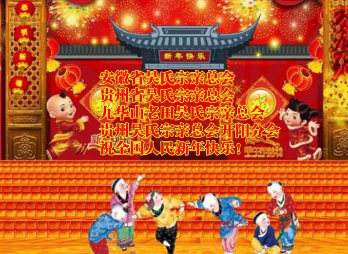 貴州吳氏宗親總會開陽分會祝全國人民新年快樂!火樹銀花辭舊歲,流光溢彩迎新春!在這喜氣洋洋,歡快熱烈的節(jié)日氣氛中,貴州省吳氏宗親總會開陽分會吳氏宗親全體成人員向全國人民拜年!向節(jié)日期間堅(jiān)守崗位的各行各業(yè)勞動者表示最誠摯的問候和最溫暖的新春祝福!春節(jié)是全國人民最重視的傳統(tǒng)節(jié)日,對于中華大地乃至天涯海角的中華兒女來說,春節(jié)是最溫馨的時刻,在這春回大地的時節(jié),人們將以各種儀式,重溫家庭和人倫親情,祝福美好生活,是民族文化中的展示,能喚起我們對感情的聚合和文化的認(rèn)同。因此,無論回家的路有多么的漫長;無論回家的票多么的難買;無論回家的天氣多么的寒冷,人們都執(zhí)著無悔地奔走在回家的路上。今天,都到家了!圍坐在父母家人的身邊,笑語在親人耳邊響起,親情在此刻匯聚最濃;歡笑在此刻傳播得最遠(yuǎn),所有的祝福在此刻表達(dá)得最深、最真。雞年已悄然離去,狗年的春天不期而至,在此,讓我們在這個喜氣的節(jié)日氣氛中,衷心祝愿在新的一年里,我們的祖國更加的繁榮昌盛,我們的人民更加歡樂幸福!