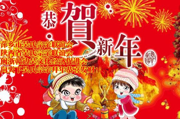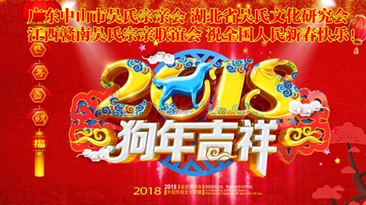 陜西省吳氏宗親聯(lián)誼會新春祝福 天下全體吳氏宗親們!大家好!值此2018,歲在戊戌,在這春滿乾坤,福滿大地,喜氣洋洋的春節(jié)來臨之際,我代表陜西省200萬吳氏宗親暨陜西省吳氏宗親聯(lián)誼會、《陜西吳氏宗譜》編委會,給各位宗親恭拜新年!祝福大家春節(jié)快樂!工作順意!身體健康!事業(yè)興旺!財(cái)源廣進(jìn)!闔家幸福!吉祥如意!陜西省吳氏宗親聯(lián)誼會會長 吳風(fēng)平。世界全體各吳氏宗親聯(lián)誼會領(lǐng)導(dǎo),及全球各地吳氏宗親們,特別是為天下吳氏奉獻(xiàn)的天下吳氏網(wǎng)創(chuàng)始人吳蜀豐宗長:大家好!值此2018年春節(jié)來臨,一夜連雙歲,五更分二年,歲在戊戌,春滿大地,福滿全球,喜氣洋洋的佳節(jié)到來。我代表陜西省吳氏宗親暨吳氏宗譜編委會,致為天下奉獻(xiàn)的各位吳氏宗親恭拜新年,祝各位宗親春節(jié)愉快,工作順利,身體健康,心想事成,財(cái)源廣進(jìn),圔家幸福,萬事如意。陜西省吳氏宗親聯(lián)誼會秘書長及宗譜主編吳世鋒敬賀。