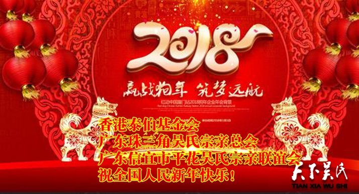 香港泰伯基金會致世界各地吳氏宗親的春節(jié)賀辭 尊敬的世界各地吳氏宗親們:滿載親情辭舊歲,激情萬丈迎新年。值2018年春節(jié)鐘聲即將敲響之際,香港泰伯基金會向生活在世界各地的吳氏宗親們、向關(guān)心和支持吳氏宗親事業(yè)發(fā)展的各界朋友們、向過去幾年來關(guān)心和支持泰伯基金會的各地吳氏宗親組織和吳氏宗親以及社會各界朋友們致以衷心的感謝和誠摯的祝福!過去一年,我們秉承“孝德宗誼”的宗旨,愛國愛港,擁護(hù)中國共產(chǎn)黨和特區(qū)政府,積極開展敬老扶貧助學(xué)公益活動,深受廣大吳氏宗親的好評和厚愛。展望未來,我們香港泰伯基金會將繼續(xù)秉承“孝德宗誼”的宗旨,繼續(xù)與各地吳氏宗親組織和吳氏宗親進(jìn)行友好的交流和合作,開展尊老敬老扶貧助學(xué)等公益活動,讓我們一起為譜寫吳氏新的篇章而共同努力!恭祝世界各地吳氏宗親: 身體健康,闔家幸福,春節(jié)快樂,萬事如意!香港泰伯基金會會長:吳立輝執(zhí)行會長吳建渤指導(dǎo)會長吳海鏞 常務(wù)會長吳炎逵、吳錦添、吳益勝、吳錦方、吳錫義、吳濱海、吳璇樑、吳明哲、吳鵬、吳國榮、吳桂宣、吳政軒、吳建忠、吳林福 常務(wù)副會長:吳鵬鵬、吳政亮、吳文元、吳銳華、吳光霖、吳昌祿。