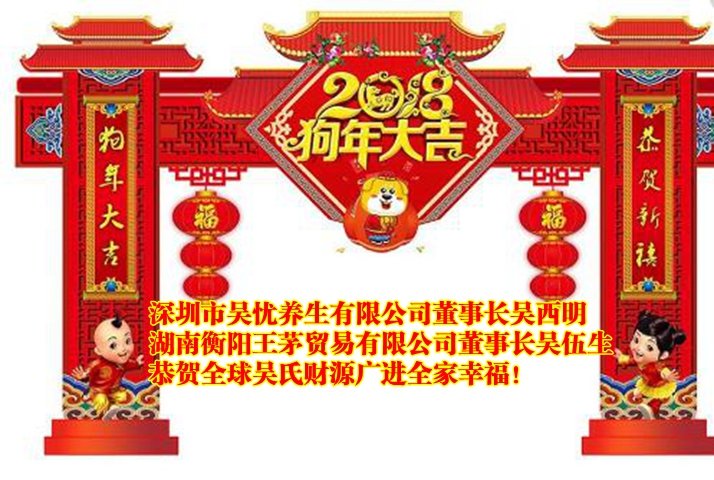 深圳市吳憂養(yǎng)生有限公司新年祝賀尊敬的宗長們、宗親們:大家新年好!我僅代表深圳市吳憂養(yǎng)生有限公司的全體宗親,向大家拜年并致以熱烈的祝福!祝福宗親們在新的一年里身體健康,萬事如意,家庭和睦!在過去的一年里,我公司董事長吳西明先生與江西宜春市宗親理事會吳波會長及首席顧問吳俊君宗長攜手合作,共同為宜春的宗親事務(wù)譜寫了新的篇章,積極參與了江西省宜春市宗親理事會及袁州區(qū)泰伯文化研究會的揭牌慶典,并捐贈2000元給宗親會購買開業(yè)禮品。在2017年的江西省宜春市年終總結(jié)大會上,我公司董事長吳西明先生再次為大會捐贈價值12980元的花青素護(hù)膚品作為年終獎品頒發(fā)給各位優(yōu)秀的獲獎宗親。寒冬臘月,大雪紛飛,本公司董事長吳西明宗親與全國各地的宗長們一起趕赴福建晉江市參加華吳五屆一次主席擴(kuò)大會議,與文富主席及各位宗長們共同昌導(dǎo)和打造2018年華吳總會提出的五大戰(zhàn)略品牌。在新的一年里,我鄭重承諾,將堅(jiān)決支持華吳總會為領(lǐng)導(dǎo)核心,與祖地宗親總會及各分會攜手共進(jìn),為華吳的五大戰(zhàn)略品牌獻(xiàn)策獻(xiàn)力。最后歡迎大家在新的一年里和我一起產(chǎn)品聯(lián)盟,實(shí)行眾籌、眾創(chuàng)、共享的營銷理念,謝謝大家!吳憂養(yǎng)生有限公司董事長吳西明。