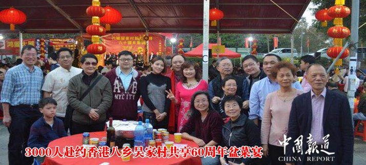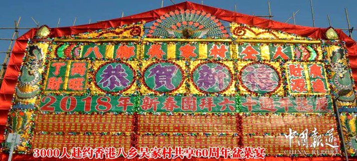 中國(guó)報(bào)道訊(記者吳蜀豐特約撰稿吳錦添)2018年2月16日(大年正月初一),按照傳統(tǒng)風(fēng)俗,吳家村舉行聯(lián)歡團(tuán)拜、千人盆菜盛宴,筵開200圍,村民和親友歡聚一堂。少時(shí)在村里長(zhǎng)大的村民,也特意回到老家感受氣氛,今年的團(tuán)拜、筵席是60周年紀(jì)念,村內(nèi)齊齊食盆菜,近3000人參與,素有客家傳統(tǒng)習(xí)俗的香港八鄉(xiāng)吳家村,過年的氛圍就充分體現(xiàn)在熱氣騰騰的大盆菜聚餐里。