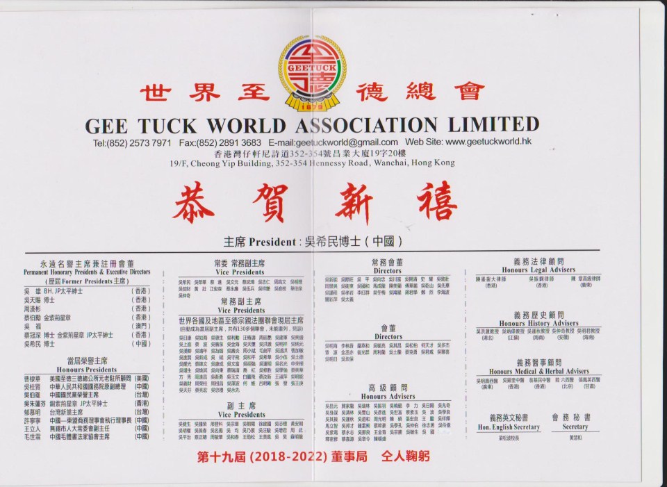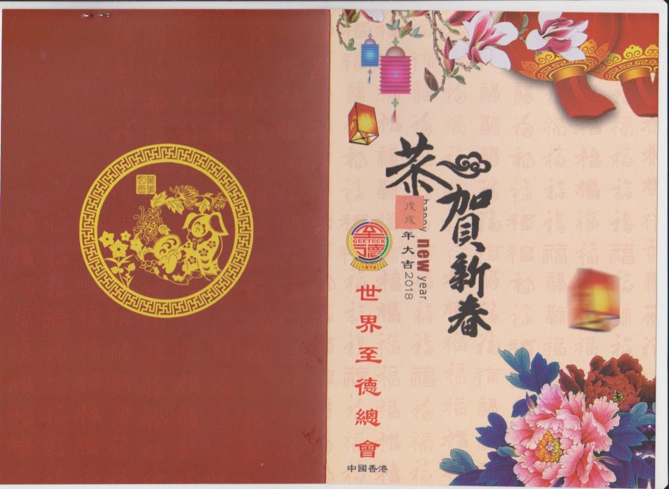 春回大地,萬象更新。在二0一八年新春佳節(jié)到來之際,我謹(jǐn)代表世界至德總會第十九屆董事局全體同仁,向全球五大洲的至德宗親及其家人拜年。恭祝你們新年快樂!在新的一年里,身體健康、家庭幸福、工作順利、萬事如意、興旺發(fā)達(dá)!