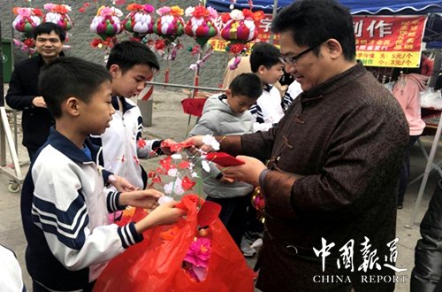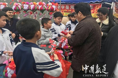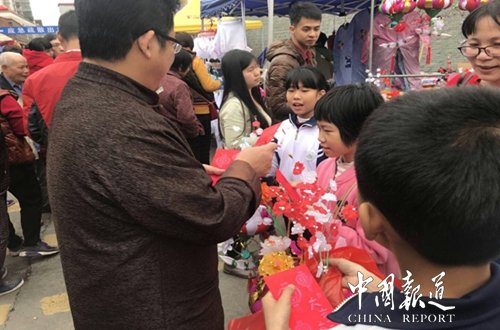 “這么漂亮的花燈,帶一盞回家吧。”隨處可見義工們舉著花燈義賣的身影。據(jù)愛心花燈義賣的宗親介紹,花燈義賣所籌集的善款將用于幫扶困難群眾和發(fā)展孝德文化兩方面。吳錦添會長走到一個幾個小朋友舉辦的“愛心花燈、快樂善行”的攤檔口,除了進行義賣捐款外,還給這幾個進行義賣的小朋友派發(fā)節(jié)日紅包。用行動踐行了泰伯基金會“孝德宗誼”的宗旨。