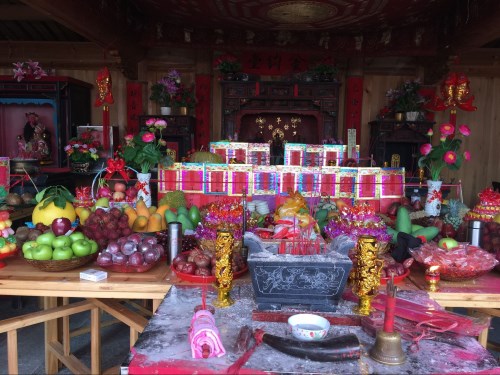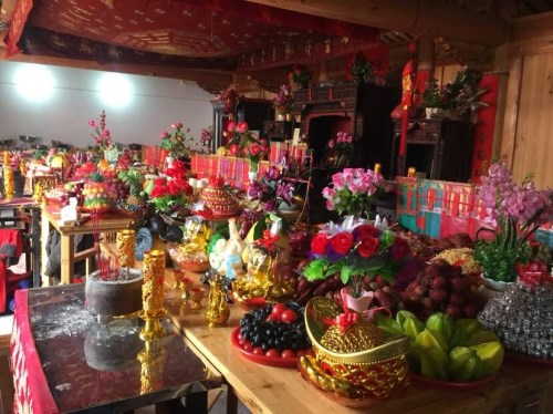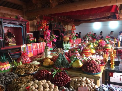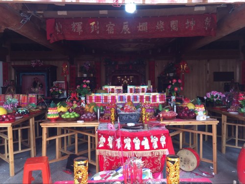 全村分成10組,一年一組的輪流。正月十四夜里起鼓,今年做佛頭的將祭供品擺到福德村吳氏家廟“金鉤堂”。