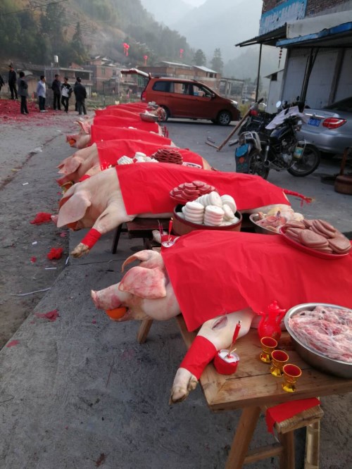 正月十六,做佛頭的殺豬祭祀,而最引人注目的,全豬祭品,它們嘴里都含著一顆柑橘,寓意吉祥如意。