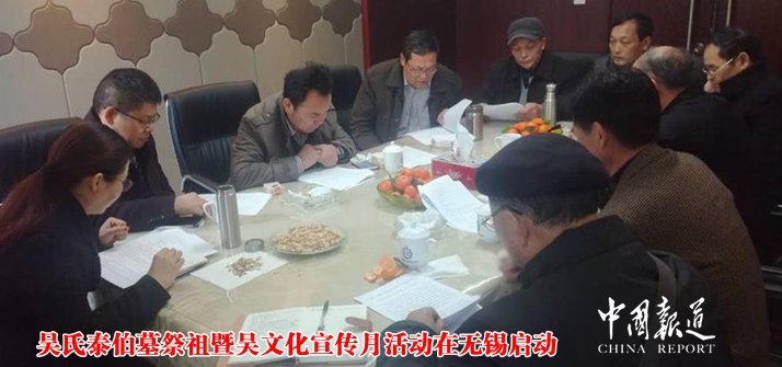 中國報道訊(記者吳蜀豐特約采編 吳建東)為弘揚中華優(yōu)秀傳統(tǒng)文化,宣傳吳文化,以傳承吳地文明,提升無錫吳文化資源與旅游開發(fā)的區(qū)域優(yōu)勢。2018年3月6日,泰伯吳氏祖地宗親聯(lián)誼總會會長吳立興、監(jiān)事長吳振達(dá)、辦公室主任吳錫泉、顧問吳士德、無錫吳文化研究會常務(wù)副會長兼秘書長陳振康、無錫吳文化研究會副會長兼無錫吳氏祖地宗親會會長吳仁山、副會長吳敏、辦公室主任吳仁興、常務(wù)理事吳建東、常州吳氏宗親聯(lián)誼會秘書長吳納新、延陵季子宗親會執(zhí)行會長吳衛(wèi)祖等在無錫吳氏祖地宗親會召開世界吳氏泰伯墓祭祖暨吳文化宣傳月活動準(zhǔn)備會議。