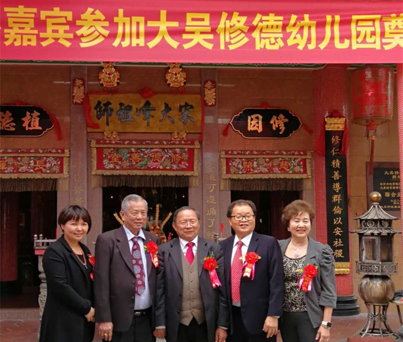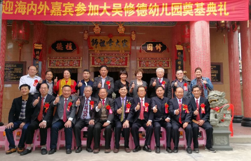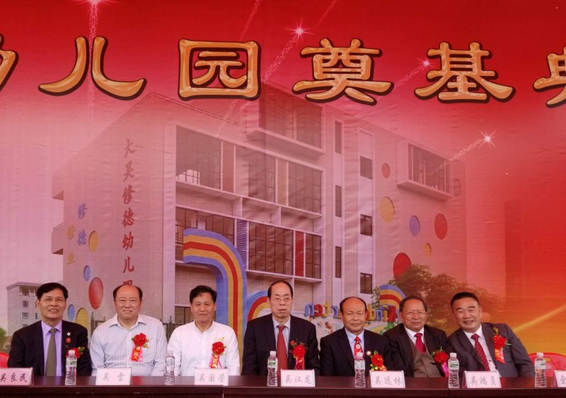 2018年3月6日,大吳修德幼兒園奠基典禮在廣東省潮州市潮安縣浮洋鎮(zhèn)大吳村隆重舉行,第二屆世界吳氏宗親總會主席、香港吳氏宗親會會長吳良民,第六屆世界吳氏宗親總會候任主席、福建廈門宗親會會長吳國榮,河南南陽吳氏文化研究會會長吳雷,廣東兩陸吳文化代會長吳遠林、常務(wù)會長吳河西,潮汕地區(qū)吳氏宗親總會常務(wù)會長吳漢龍、秘書長吳彬宗長等人應(yīng)邀出席了活動。