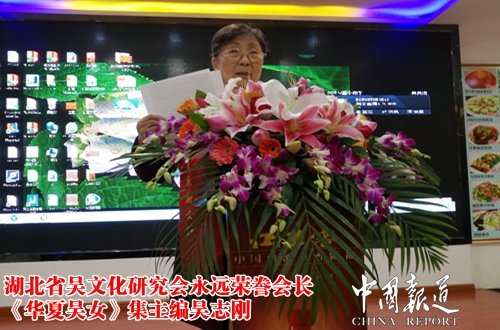 吳胡振宇說(shuō),我是來(lái)自中國(guó)第一將軍縣——紅安縣的吳胡振宇,是紅安吳氏文化研究會(huì)會(huì)長(zhǎng)。很榮幸受邀參加今天的活動(dòng)。吳曉恒將軍是中國(guó)第一將軍縣紅安吳氏的杰出代表,86歲高齡的她,在建設(shè)第一軍醫(yī)大學(xué)(今南方醫(yī)科大學(xué))的艱苦歲月中成績(jī)卓巨,勞苦功高,被黨和軍隊(duì)授于少將軍銜。她是我們吳氏姐妹的驕傲!“志異征誅三讓兩家天下,功同開(kāi)辟一抔萬(wàn)古江南。”吳氏文化源遠(yuǎn)流長(zhǎng),博大精深。自我們始祖泰伯奔吳開(kāi)國(guó)傳姓開(kāi)始,開(kāi)啟了吳氏文化之先河。吳氏兒女在祖輩的庇佑下,傳承吳氏文化基因,歷朝歷代,涌現(xiàn)了許許多多名優(yōu)秀人才。而我們吳氏女性在家族文化的熏陶下,都能做到嚴(yán)于律己,勤奮創(chuàng)業(yè),賢良持家,教育后人,廣結(jié)善緣,可謂巾幗不讓須眉! 可以這樣說(shuō),華夏吳氏女性在繁衍后代、文化傳承、社會(huì)發(fā)展中發(fā)揮著不可替代的作用。今天,《華夏吳氏女性》會(huì)刊創(chuàng)刊號(hào)盛大發(fā)行,是我華夏吳氏發(fā)展史上的一項(xiàng)盛舉;是傳承吳氏文化,頌揚(yáng)華夏女性,標(biāo)榜時(shí)代精英,激勵(lì)教化后人的又一宏大工程?!度A夏吳氏女性》會(huì)刊創(chuàng)刊號(hào)的問(wèn)世,是吳氏兒女孜孜不倦地收集、采編、校對(duì)才有了今天的大作。讓我們用最熱烈的掌聲,對(duì)辛勤參與編寫(xiě)《華夏吳氏女性》會(huì)刊的各位宗親,表示最崇高的敬意和最誠(chéng)摯的感謝!(鞠躬)