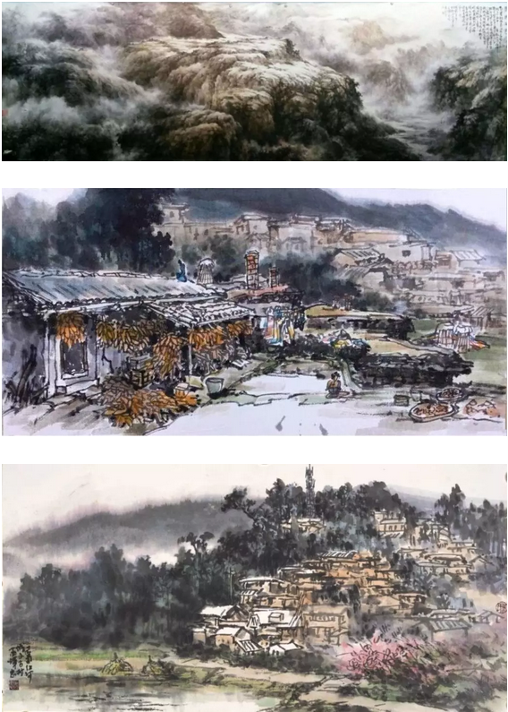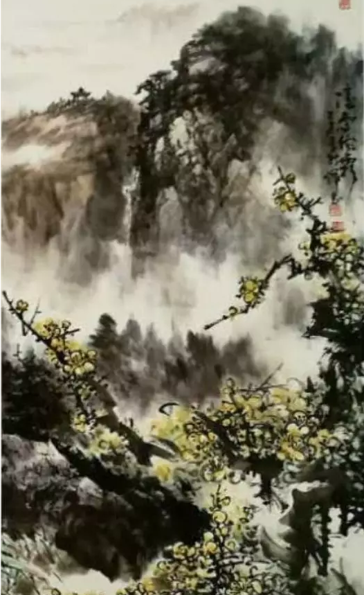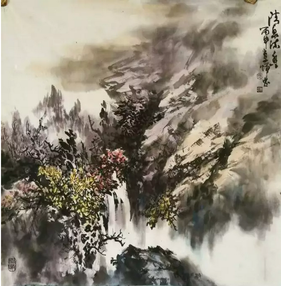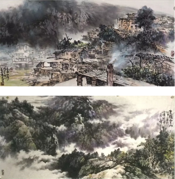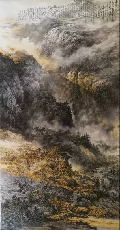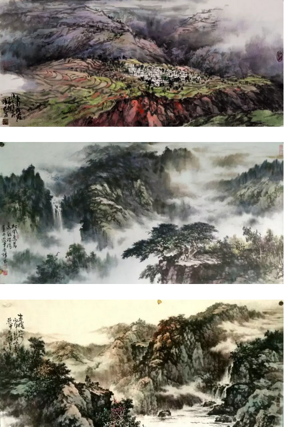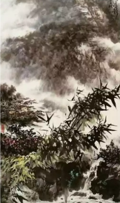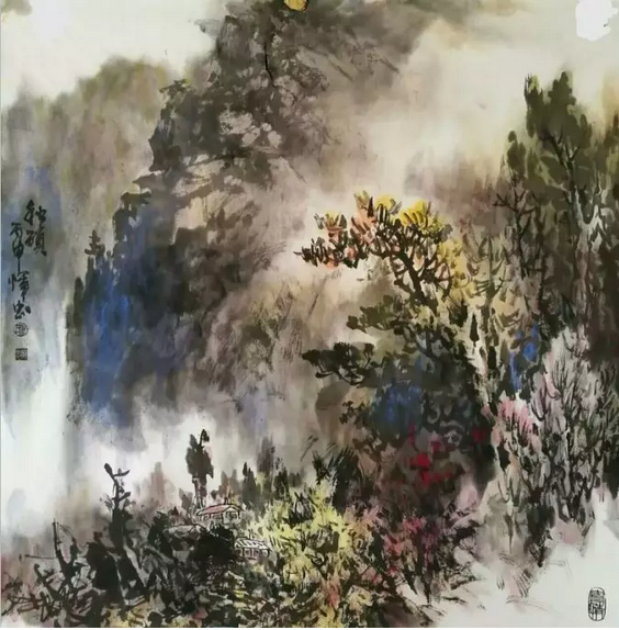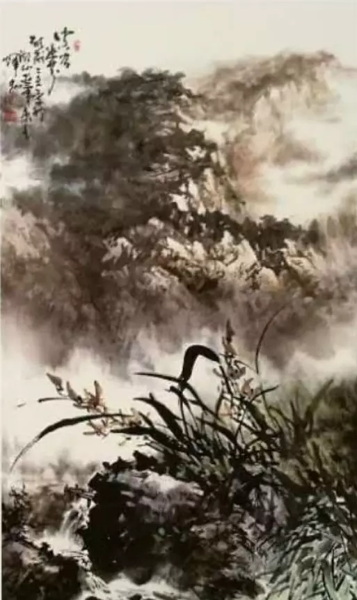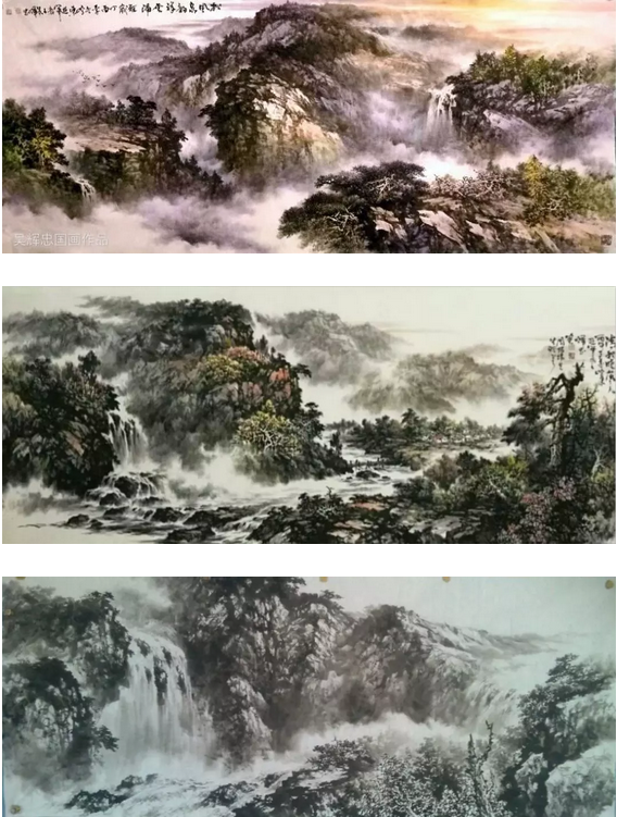 縱觀吳輝忠的作品,氣韻生動,神形涌溢。無論著墨、敷彩、落筆用線、點染積皴,都把墨韻肌理、筆觸,發(fā)揮得淋漓精致,被他自稱為“拖墨帶水”、“見筆云”的表現(xiàn)手法尤為獨特,直逼傳統(tǒng)山石皴擦的技法。他的山水畫大而不空、有勢有質(zhì),即有開闊視野,近觀質(zhì)樸。大氣勢、大筆墨,又不遺余力把握細節(jié)。遠觀則山巒厚實、云霧飄逸,近看則樹木蒼郁、草苔青翠;遠有氣勢、近具質(zhì)味。個性十足,內(nèi)涵豐富、運筆得心應(yīng)手,靜溢虛渺,能入“神馳清幽之地”。