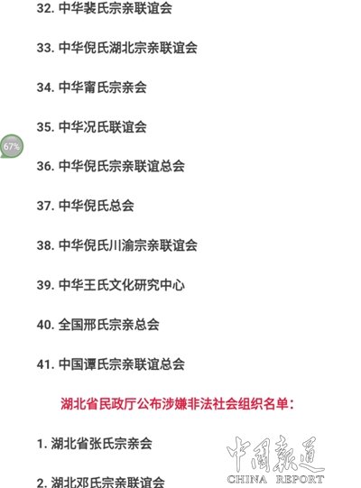中國(guó)報(bào)道訊(記者吳蜀豐)民政部社會(huì)組織管理局近日繼續(xù)公布一批未在民政部門登記的涉嫌非法社會(huì)組織名單,涉及“世界劉氏總會(huì)”、“世界華人郭氏宗親聯(lián)合會(huì)”、“世界姜姓宗親聯(lián)誼總會(huì)”、“中華高姓歷史文化研究會(huì)”、“世界韓氏宗親聯(lián)誼總會(huì)”、“湖北吳氏文化研究會(huì)”等65家涉嫌非法社會(huì)組織。涉嫌非法社會(huì)組織名單41家,湖北省民政廳公布涉嫌非法社會(huì)組織名單5家,離岸社團(tuán)、“山寨”社團(tuán)名單19家。