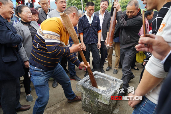 傳統(tǒng)技藝抖糍粑。抖糍粑是自毛俊村建村以來就有的習(xí)俗,一直沿襲至今。周來古說,毛俊村民每到過年時就會用糯米蒸成糯飯,趁熱倒入抖池內(nèi),兩名壯漢拿著抖槌用力抖。抖、捻、轉(zhuǎn)等等環(huán)節(jié)較多。待將糯飯抖成糍粑狀,趁熱最好吃。吃不完就攤成餅狀,待來年用油一炸,香酥可口。