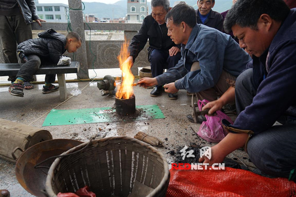 傳統(tǒng)技藝補鍋。技術(shù)要領(lǐng)在于用金剛泥做成一個碗狀大小的融鍋,放在炭火上燒至上千度將鐵塊融化成鐵水,倒進(jìn)有砂眼的爛鍋上。周來古介紹說,毛俊村是一個以外來人口為主的百家姓村,補鍋最開始是一個來自衡陽的歐姓人家。在毛俊村歷史上,補鍋曾經(jīng)是村民們主要的經(jīng)濟(jì)手段。由于該工程比較臟、高溫鐵渣容易燒爛衣服,加之現(xiàn)代的工藝水平在提高,補鍋也漸漸成為一種歷史技藝。
